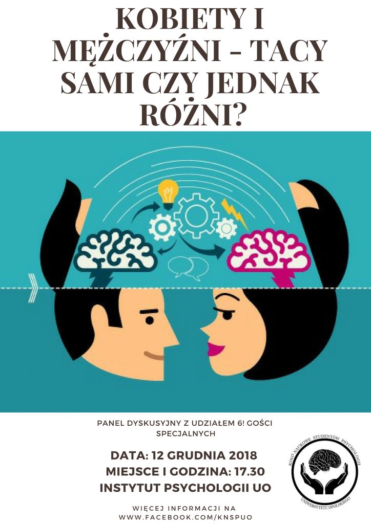 Koło Naukowe Studentów Psychologii UO zaprasza na pierwszy panel dyskusyjny, który odbędzie się w środę 12 grudnia o godzinie 17:30 w Instytucie Psychologii UO. Temat panelu to „Kobiety i mężczyźni – tacy sami